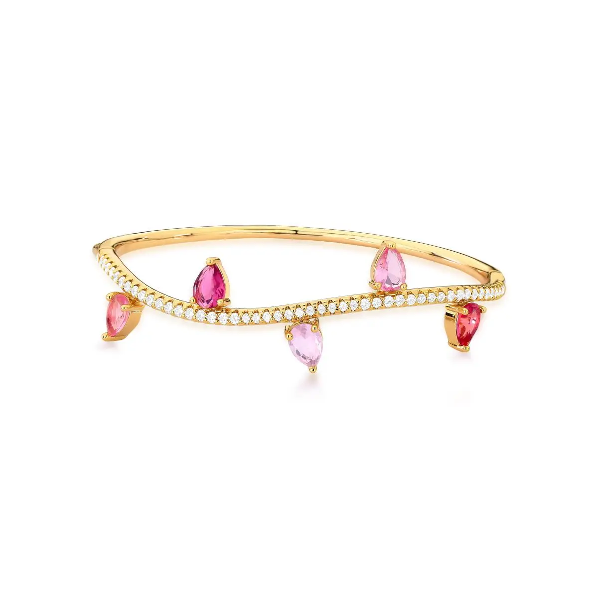 Bracelete curvo, com cristais em formato gota, cravejado de zircônias,e fecho de click. Quem viveu sua adolescência no final dos anos 1990 certamente celebrou o nascimento de um ícone da música: Britney Spears. A cantora norte-americana é dona de hits inesquecíveis, performances emblemáticas, muitas polêmicas e claro, muito estilo. E esse seu estilo único de sempre utilizar joias no dia a dia, inspirou a delicada e marcante coleção Spears (que também significa “lanças” em inglês, a forma dos cristais que apresentamos). Peças que antes eram restritas a festas e eventos, ganham cada vez mais espaço nos looks do dia, exibindo no street style a beleza de joias que não precisam ficar mais guardadas, tornando as ruas um verdadeiro desfile. Celebre o sucesso das vendas dessas peças inspiradas na alta joalheria, cravejadas em zircônias brancas, com cristais ametista, água marinha e rosa.