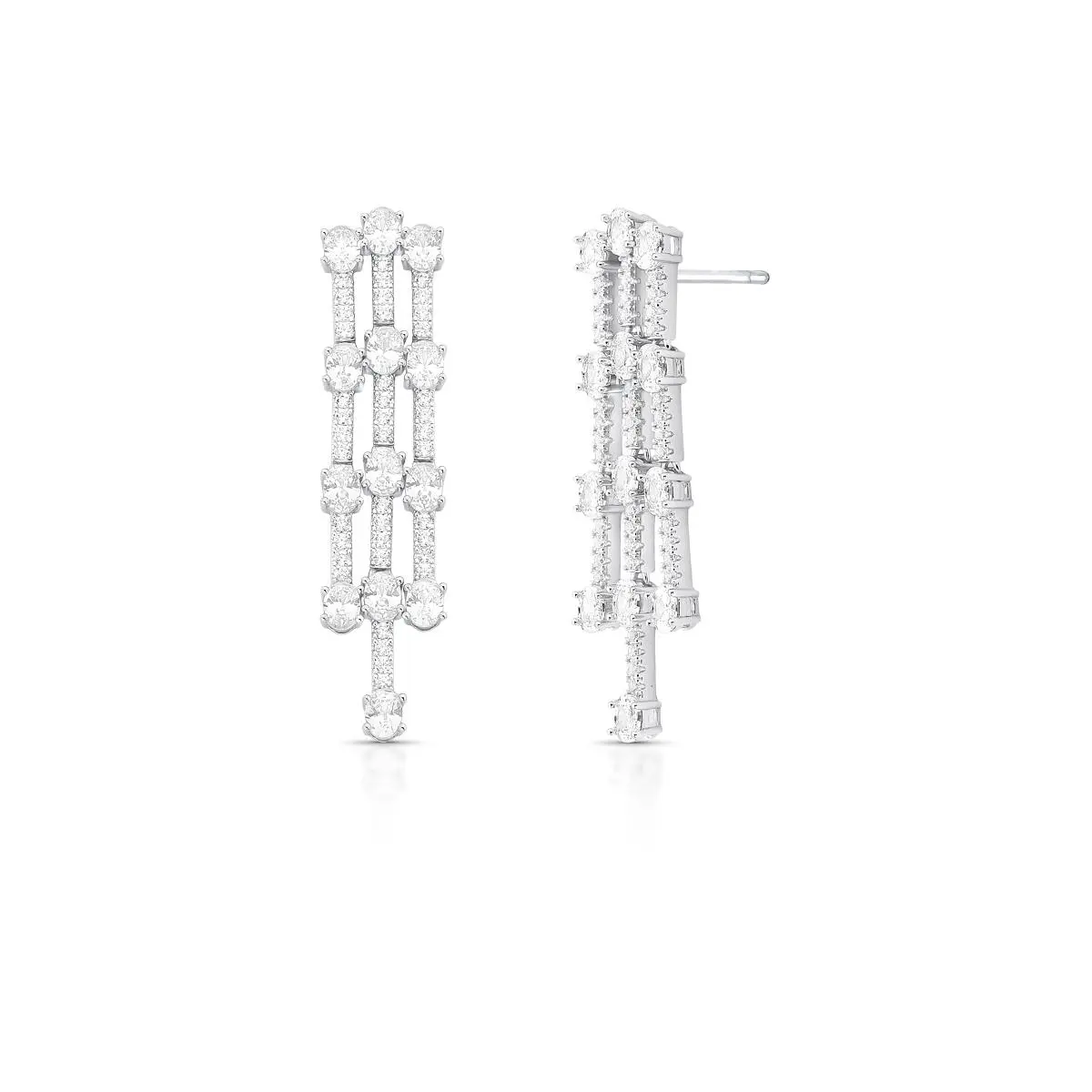 Brinco banhado a ródio com cristais ovais intercalados por zircônias, em design pendular elegante e sofisticado. Peça perfeita para valorizar seu visual com brilho e delicadeza.