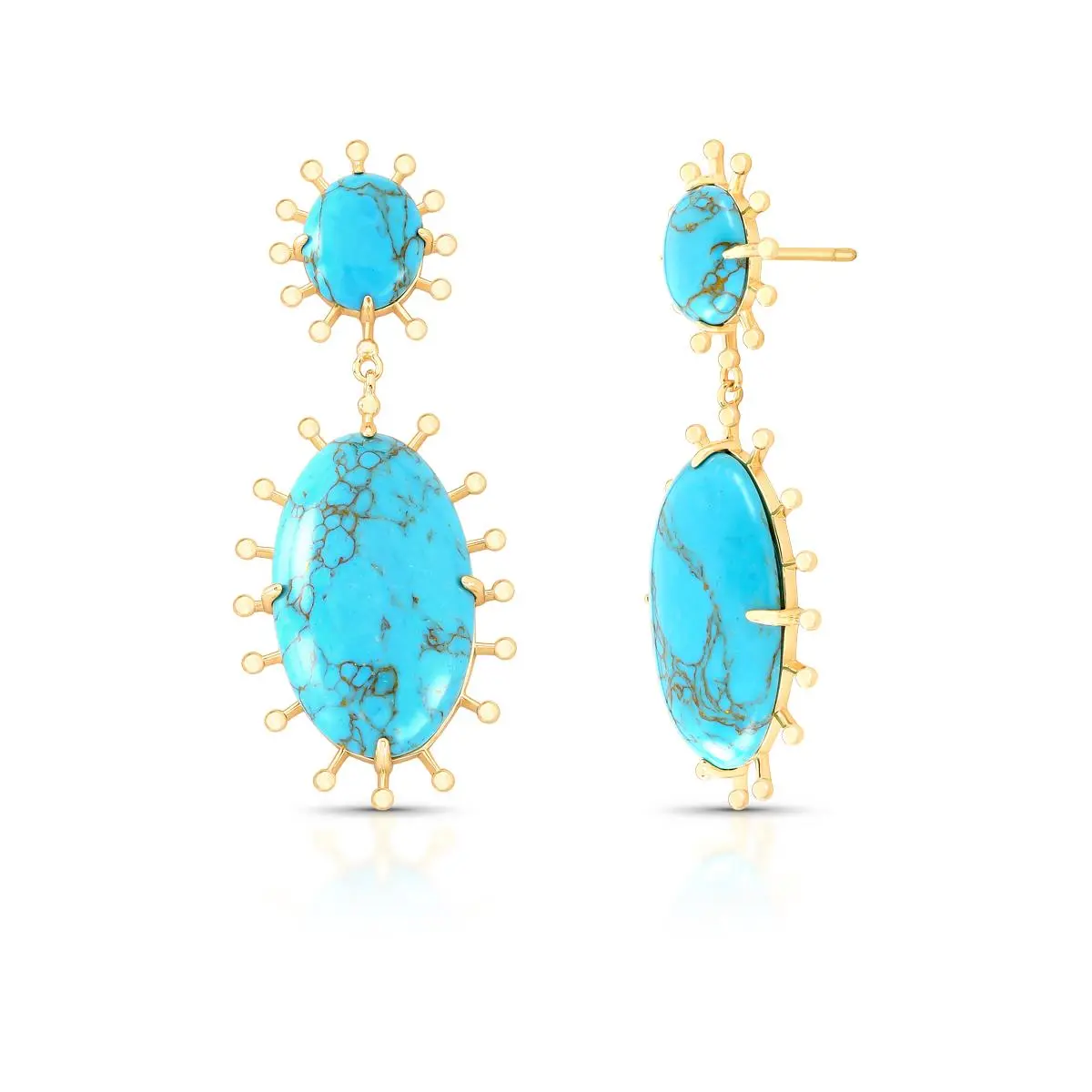 Brinco pêndulo banhado a ouro com pedras reconstituídas em formato oval e esferas lisas que criam um contorno elegante. Ideal para quem busca um acessório sofisticado e moderno para destacar o visual com delicadeza e charme.