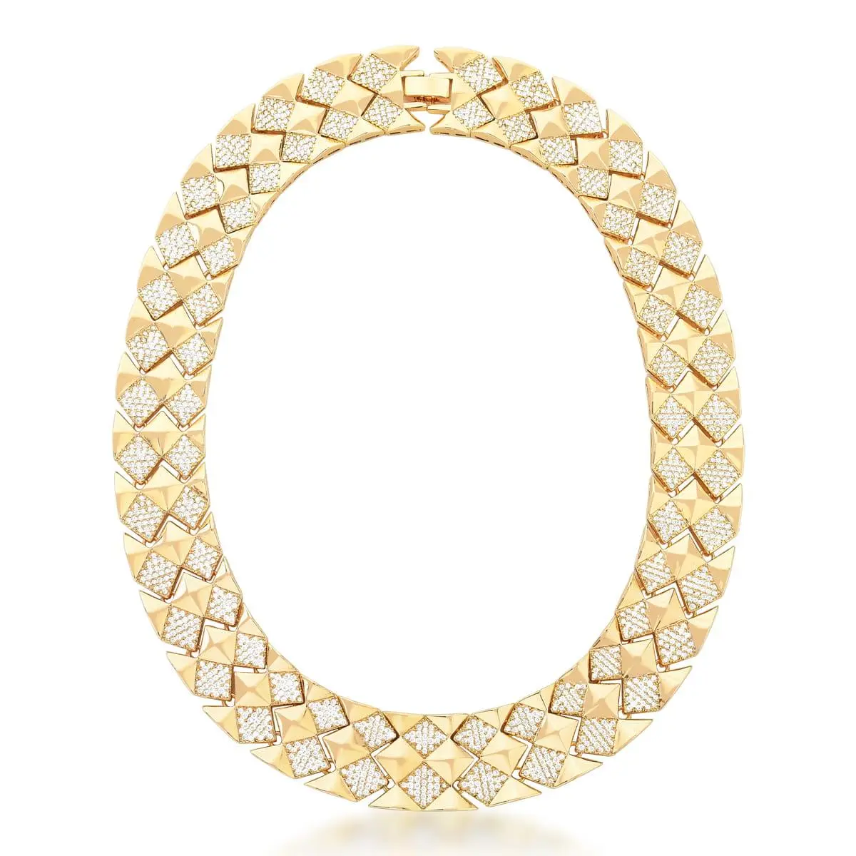 Colar duas fileiras em formato de losangos lisos e cravejados com zircônias brancas, banhado a ouro. Modernidade e sofisticação, é como se remete esse acessório sendo uma peça versátil podendo usar em qualquer ocasião e estação.